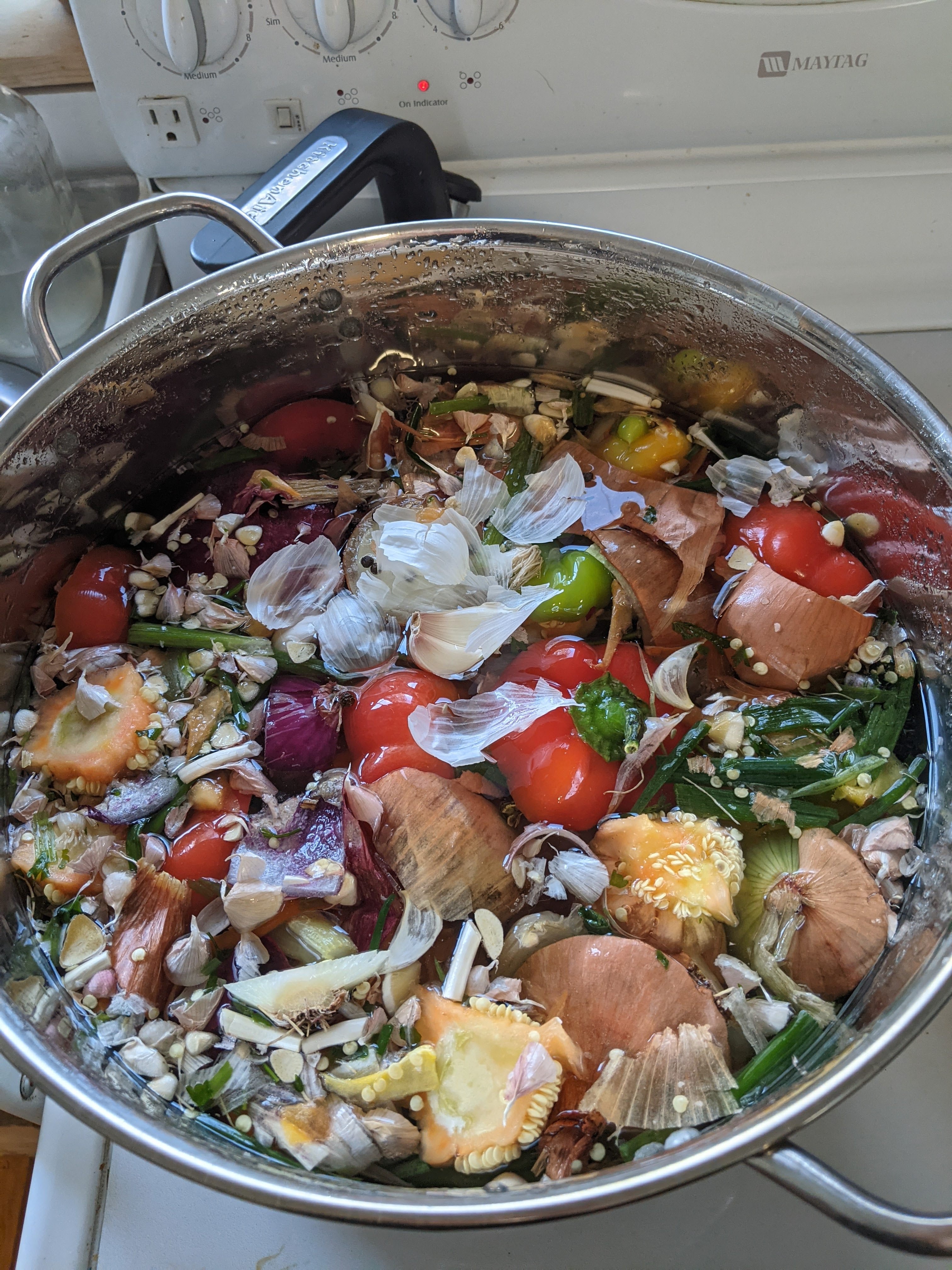 Once the ingredients are in the stockpot, and well-covered with water, I add some simple flavourings. In terms of herbs, there are always stems and such from parsley in my scrap bag. I will usually add a couple of bay leaves and a handful of whole peppercorns. I don’t like to add too many other herbs, because I want my finished stock to be as versatile as possible, and to be usable in many different preparations. I don’t want to add a “minty” stock, for example, to a bolognese-style sauce. I do add salt to my stock, because I think salt is important in good home-cooking and because my family doesn’t have to avoid sodium for health reasons. Like the question of sugar in homemade jam though, I think that the salt in commercially-processed foods and restaurant meals is a far greater health concern than the use of minimal amounts of salt in home-prepared, from-scratch foods. In fact, one of my reasons for making my own stock is that I am able to control the amount of salt in my food. A good handful of kosher salt in a pot of nearly 10 litres of homemade stock is not a reason for concern, for my family. But, if you cook for someone with blood pressure concerns, or other cardiac disease, it can be great to know, beyond hesitation, that the stock you are using contains absolutely no salt.