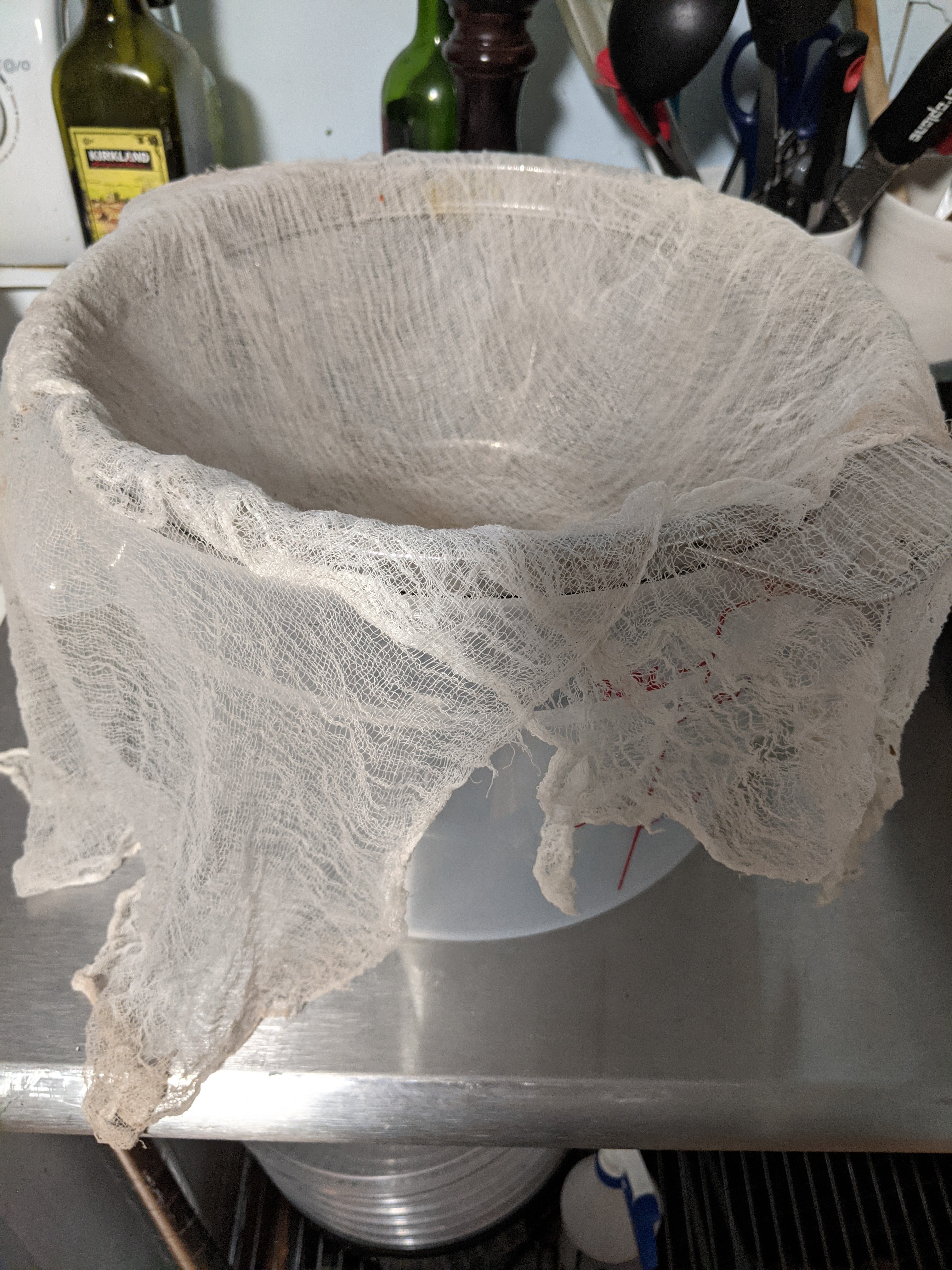 Now, certain chefs, cookbook writers and YouTube food vloggers will insist that there are all kinds of rules to making stock. You must roast the bones. You must skim the stock at set intervals. You must rinse your bones multiple times. You must only use the highest quality, most expensive, organic ingredients available. You must call it “bone broth” and only cook it at the waning moon. And so on. I do none of this. Every so often, I might get a surge of energy and momentum, and attempt to skim my stock. This never lasts longer than five minutes, as I remember that it’s a never-ending battle against impurity, and no one is going to be awarding Michelin stars at my dinner table. Heck, I don’t actually have a dinner table. I bring my stock to a boil, turn it down to low, and ignore it for a very long time. Then, I line a sieve/colander with a few layers of cheesecloth (if you try many of my projects, you will need to buy some of this stuff. It’s cheap, and despite what it says on the package, it’s totally reusable), and place it over a big pot, bowl, or container.