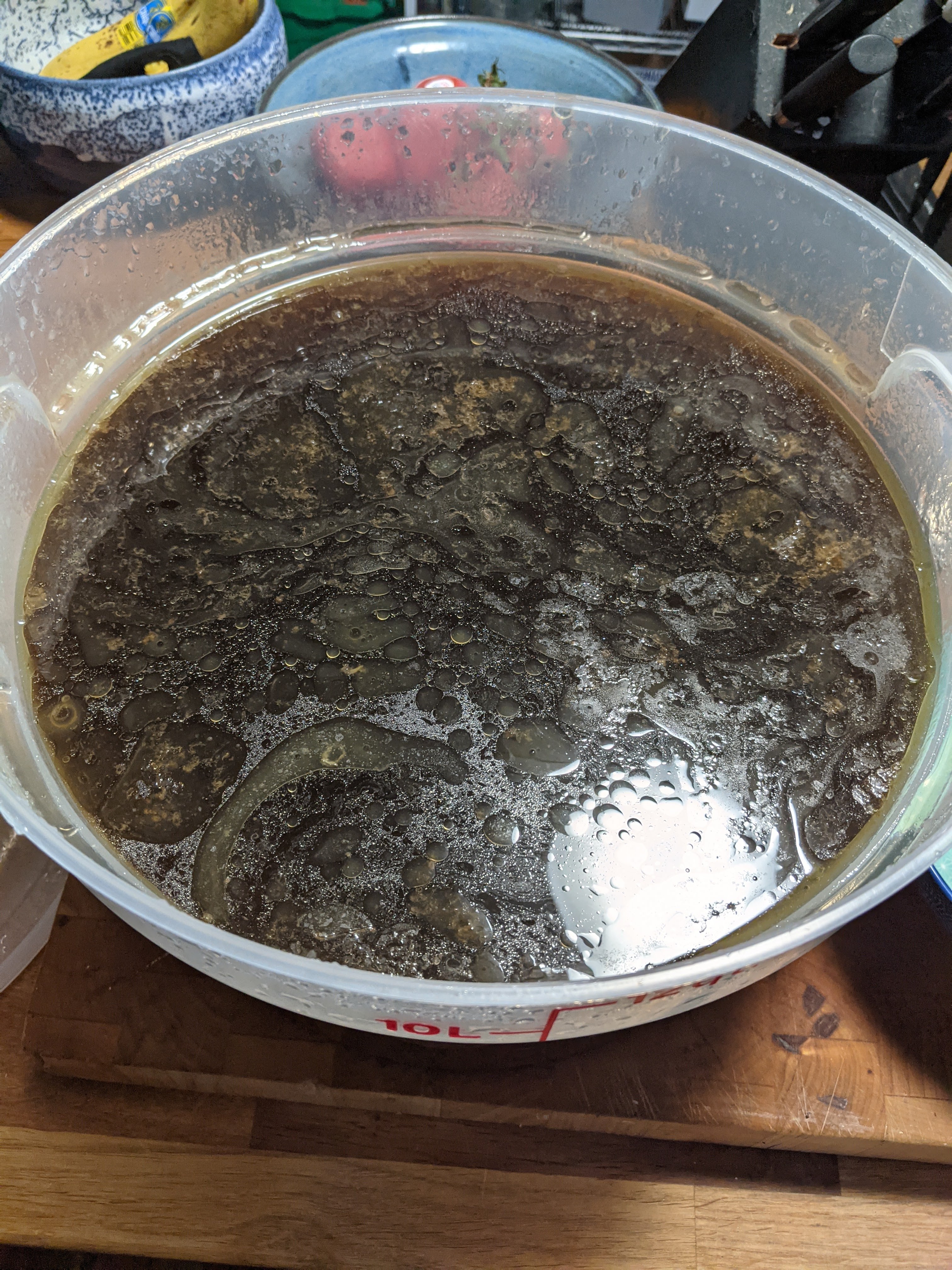 With everything ready to go, I bring my stock up to the boil fairly slowly. Making stock this way is a long process, and rushing just results in stock that isn’t as rich or tasty as it could be. The great thing is, this is almost entirely hands-off cooking. Just put your pot on a burner, and check in on it every so often. You don’t need to hover. I have encouraged both my daughters to make stock on their days off (the weekends, when they were students) because it is entirely compatible with doing homework, doing housework, or working on other projects while the stock cooks. Once it comes to a boil, I turn the heat right down to low, so that only the occasional bubble breaks the surface. Then I leave it. For days. Yes, really. My stock cooks very slowly, at the back of my stove, for days on end. You may have more intense fire-safety concerns than I do, and worry about leaving a burner on overnight, or you may not be a hermit like me, and actually leave your house sometimes. In that case, I encourage you to cook your stock for as long as you can. Stock cooked for a few hours on a lazy Saturday is EXCELLENT. I am just very lazy.