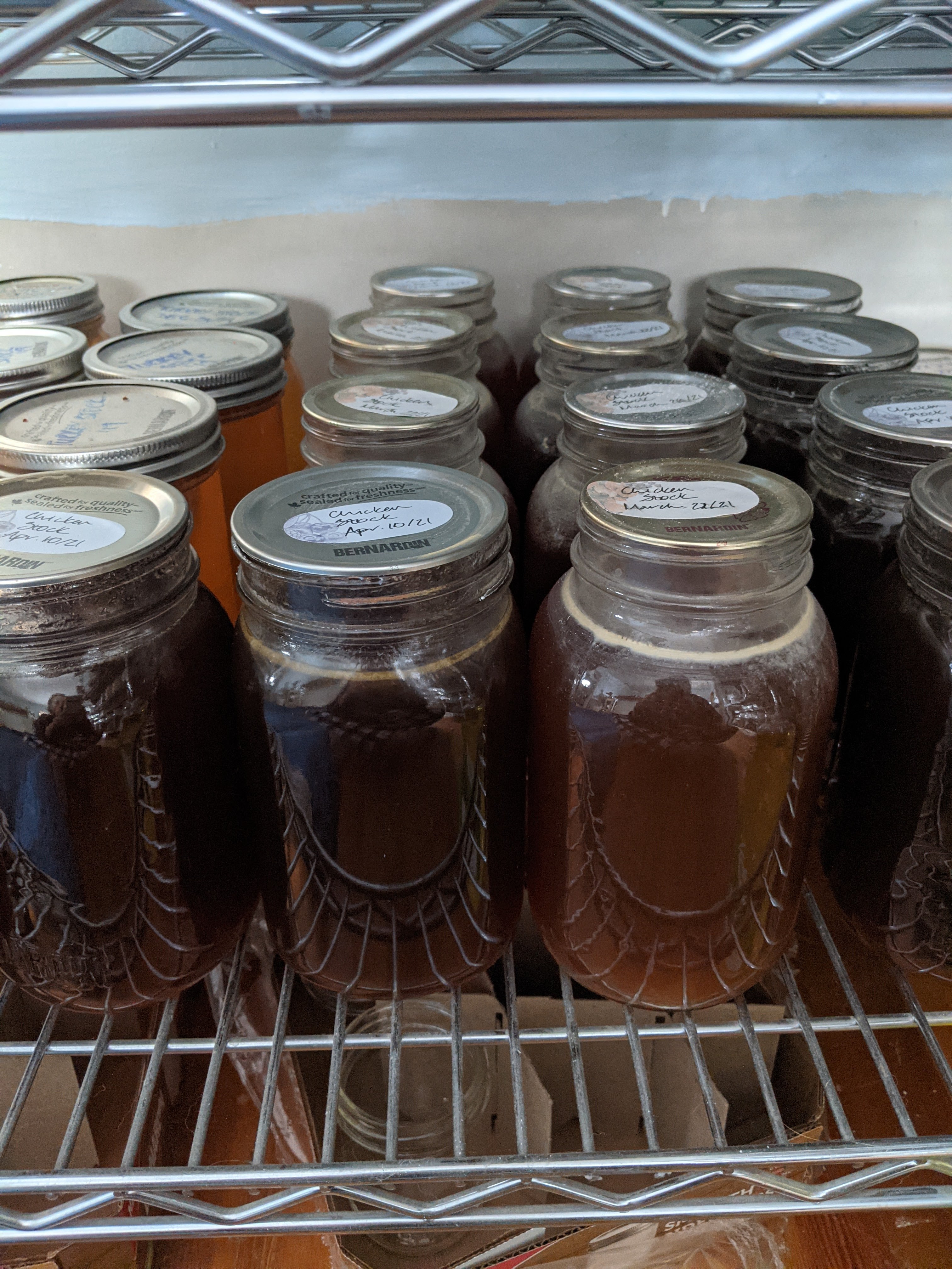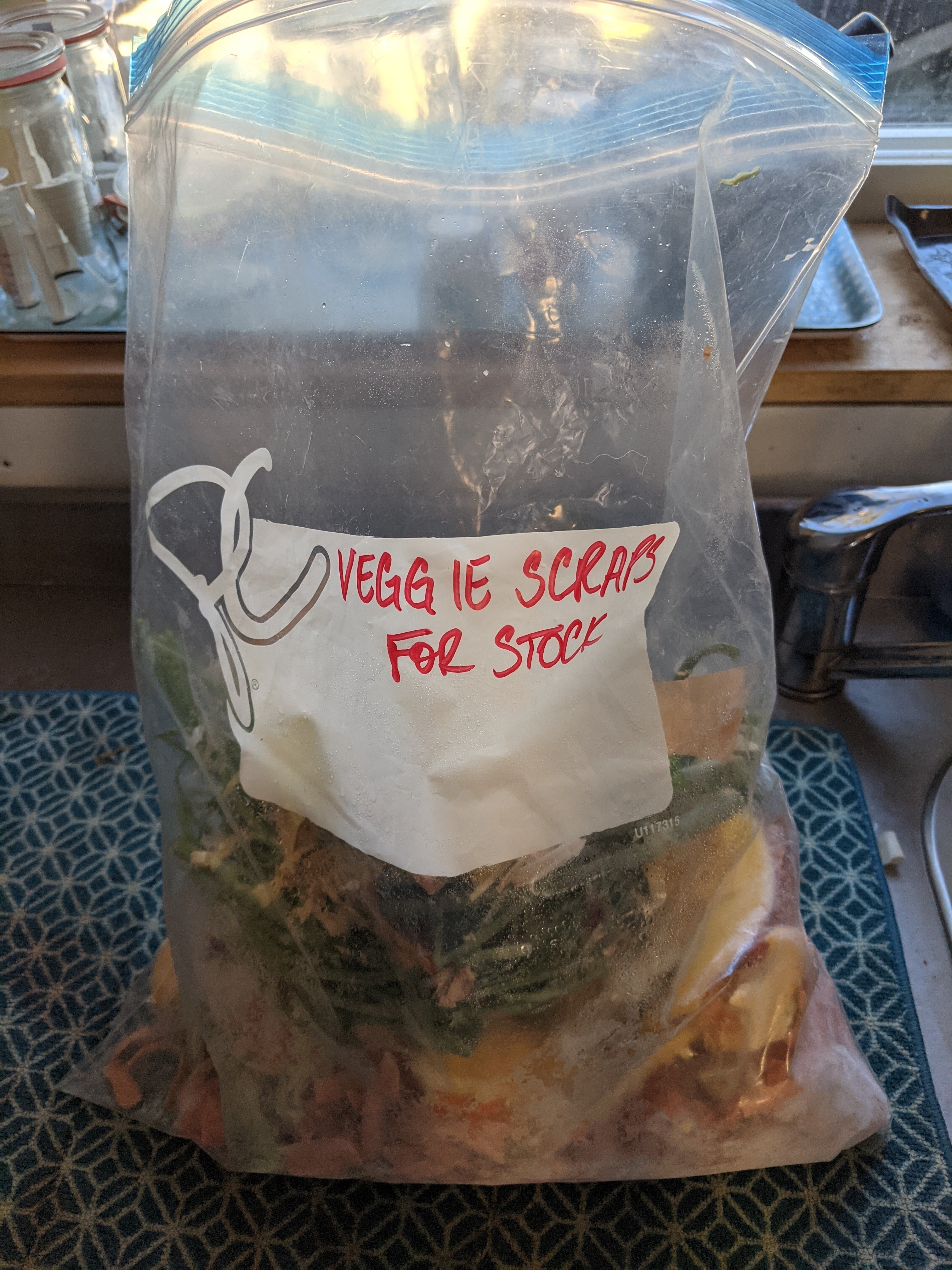 Once the fat has been removed from the stock, it’s ready to use. Chances are good that we will have risotto for dinner, fairly soon after I make a batch of stock. If you make stock in the IP, or if you don’t have a giant pot to make stock in, and thus make smaller batches, you can keep your stock in the fridge. It should keep for three to four days (perhaps slightly longer). A small batch of stock is perfect to make soup with, especially if you happen to also have some leftover chicken to throw in your stock. Another option, if you have it, is to freeze your stock. In the freezer, stock will keep for at least three months, and probably much longer, especially if you make sure that it is cold when it goes in. ALWAYS LABEL EVERYTHING YOU PUT IN YOUR FREEZER, AND INCLUDE THE DATE! I say this out of love, so you won’t repeat my mistakes. These days, I keep a roll of painters’ tape and a sharpie in a small, magnetic container on my fridge, for all labeling emergencies. It’s not Martha Stewart-level, beautiful organization, but it does the job. Which is reminding me to use stuff that I worked to make. Anyway! You can freeze stock in plastic containers (do you, perhaps, share my addiction to saving old yoghurt tubs?), or in ziploc bags, if you can be certain that you have closed them completely. I cannot. I used to store all my stock this way. It’s great to have this cheap/free ingredient on hand. However, a few years ago, I invested in a bulky and somewhat terrifying piece of kitchen equipment that revolutionized my stock portfolio (you knew there was going to be another bad pun here), as well as so many other aspects of my kitchen life. And I am not going to share it with you until my next post. I am so mean. Here’s a teaser…